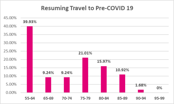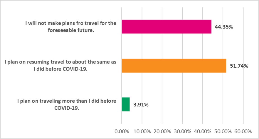 Key Findings: Over half plan to resume travel to about the same as they did before COVID. 44% Will not make plans to travel for the foreseeable future.